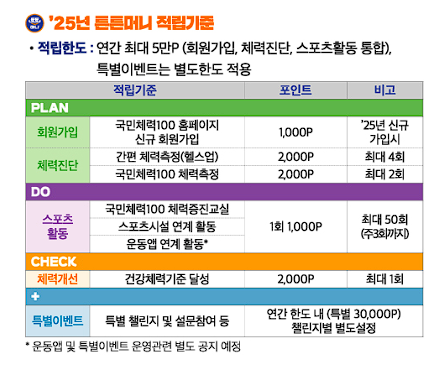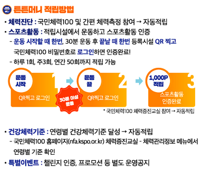 ✅ 특별 챌린지 및 이벤트: 연령별 건강체력 기준을 달성하면 보너스 포인트가 적립됩니다. 또한, 특정 기간 동안 진행되는 특별 챌린지에 참여하면 더 많은 포인트를 받을 수 있습니다.